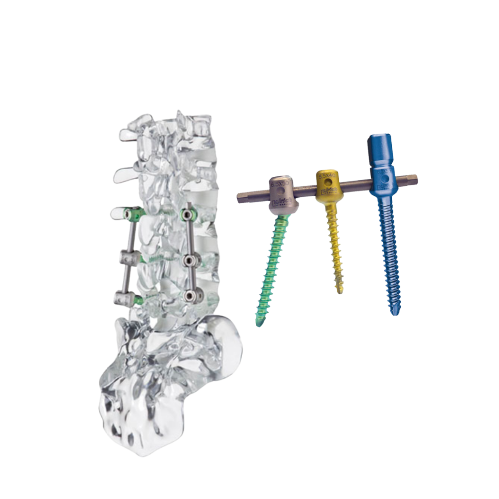 IntraSPINE – Sistema de estabilización dinámico respetuoso del eje de rotación del segmento. Su soporte laminar cerca del eje de rotación permite descompresión y una corrección de la lordosis mejor que otros dispositivos posteriores. Producido francés.